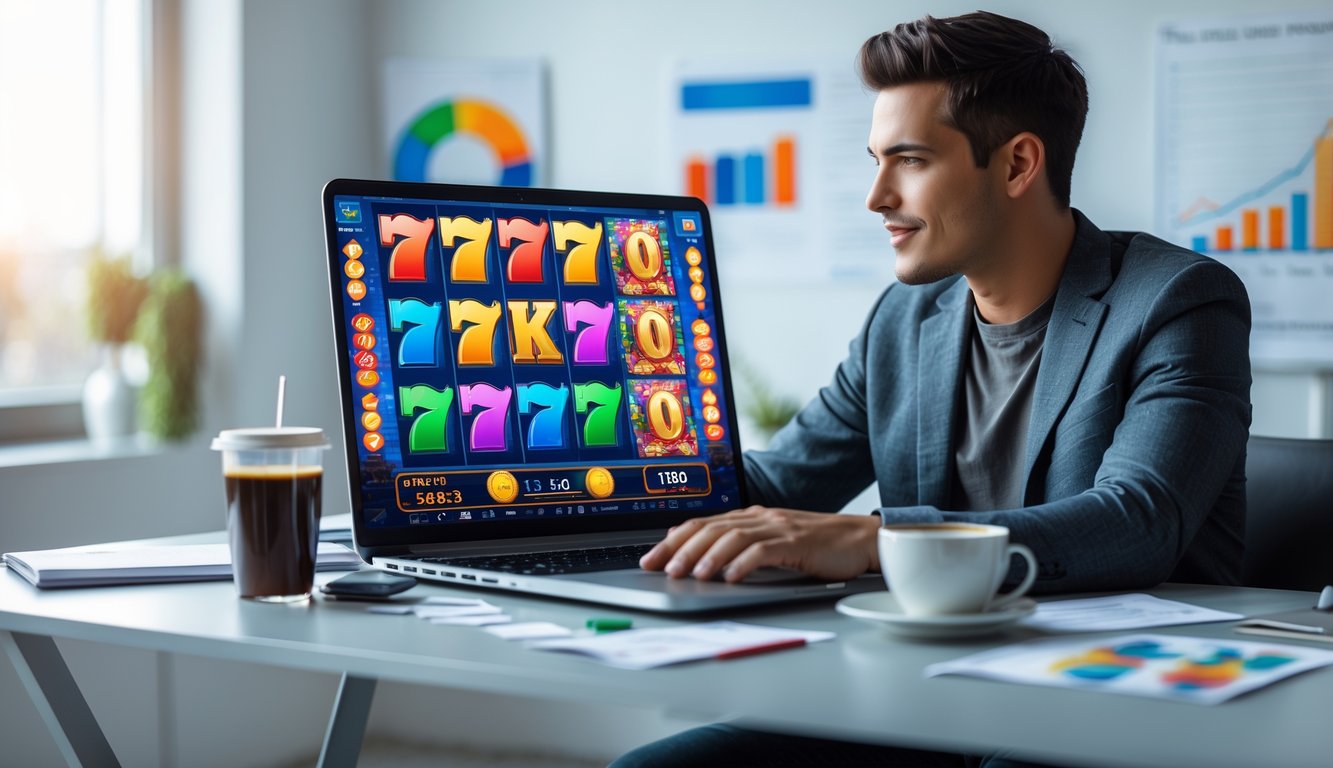 Seseorang duduk di depan laptop dengan layar permainan slot online, terlihat fokus dan percaya diri di ruangan yang terang.