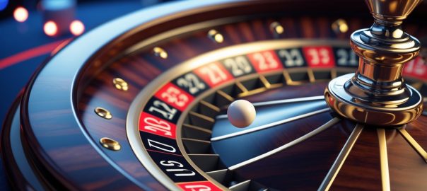 Roda roulette Eropa dengan bola putih yang sedang berputar di latar belakang kasino online.