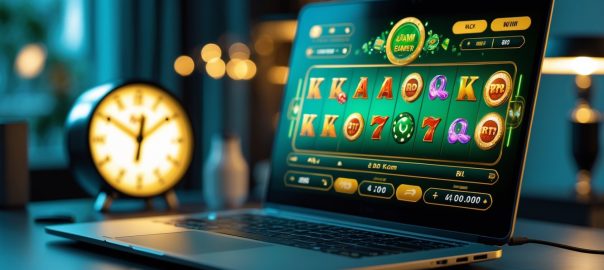 Seorang pemain sedang menggunakan komputer dengan tampilan permainan slot online berwarna-warni di ruangan yang nyaman, dengan jam di latar belakang menunjukkan waktu keberuntungan.