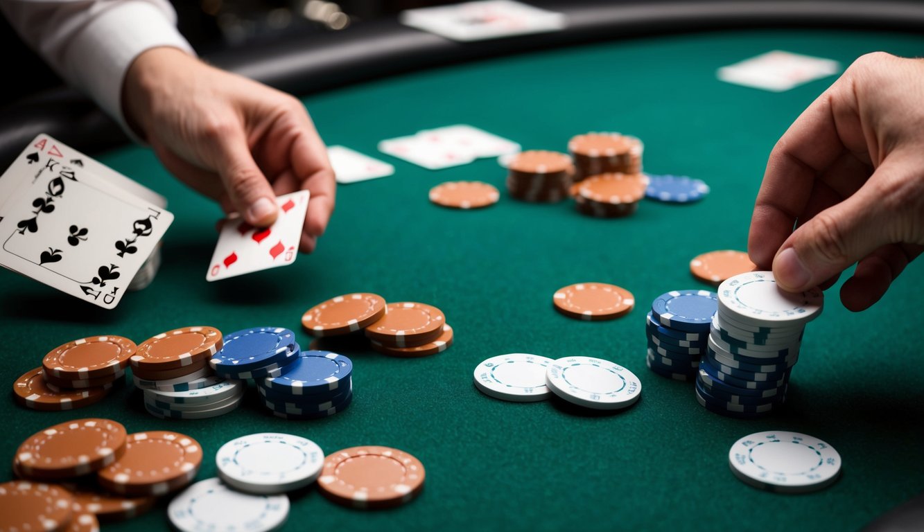 Sekelompok chip poker tersebar di atas meja felt hijau, dengan kartu yang dibagikan oleh tangan dealer.