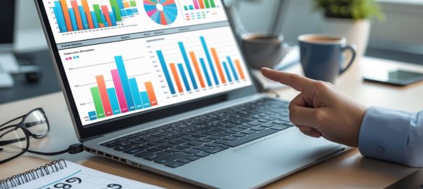 Meja kerja dengan laptop yang menampilkan grafik dan tangan menunjuk ke layar, dilengkapi dengan catatan angka di atas meja.