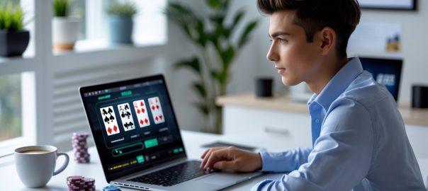 Seorang pria muda duduk di meja dengan laptop, fokus bermain poker online di ruang kerja yang nyaman dan terang.